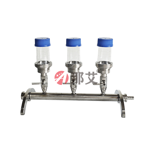 微生物限度薄膜過濾支架(NAI-STV3);濾杯,抽濾瓶和真空泵等組成微生物過濾系統(tǒng)。該產(chǎn)品為三聯(lián)微生物過濾支架,配合微生物檢測專用泵使用,形成完整的薄膜過濾裝置。使用時(shí),將濾膜置于泵頭上,并用濾杯固定壓緊,形成一個(gè)完整的過濾裝置,基于薄膜過濾法的原理,將樣品溶液與微生物分離并將微生物截留于濾膜上,轉(zhuǎn)移濾膜,在特定的條件下培養(yǎng),使濾膜上的微生物恢復(fù)生長,形成肉眼可見的菌落,然后進(jìn)行菌落計(jì)數(shù)和鑒定。